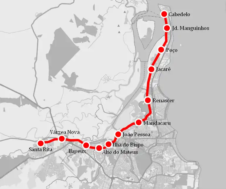 It currently consists of 12 stations on a single line of 30.03 kilometers, which interconnects the municipalities of Santa Rita, Paraíba, Bayeux, João Pessoa and Cabedelo, carrying an average of 11,600 passengers per day.