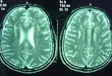 T2-weighted MRI images of a 25-year-old male with Sjögren–Larsson syndrome revealing dysmyelination in the deep periventricular white matter and reduced brain volume in the frontal lobe.