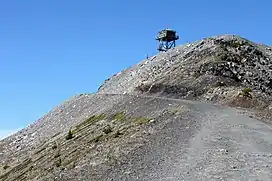 The fire lookout tower was originally constructed as a gable-roof cupola in 1924. In 1956 the Air Force leveled the mountain summit by removing 40 feet from the top of the peak (as well as the lookout) in order to install a radar station, which was never built. The present lookout sits atop a 41-foot tall tower which is maintained for emergency use. The Slate Peak Lookout was added to the National Historic Lookout Register on November 4, 2000.[4] On a clear day, visitors can see Silver Star Mountain, The Needles, Tower Mountain, Golden Horn, Azurite Peak, Mount Ballard, Jack Mountain, Crater Mountain, Monument Peak, Robinson Mountain, and many others from the tower.