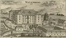 Dob was the site of Wazenberg (or Watzenberg) Castle (Slovene: Dob).[2] The castle was mentioned in written sources in the 14th century, passing through ownership of the Aych, Pyrsch, and Schranckler families before being purchased by the Wazenbergs in 1621. It was then sold to Franz Bernard Lamberg 1723 and to Jobst Weickhard Barbo, Count of Wachsenstein in 1740. The Barbos merged the estate with the estate in Rakovnik, and it remained in the family until the Second World War.[12] On 26 and 27 December 1942, Wazenberg Castle was attacked by the Partisans, who killed all of the residents (including Felix Logothetti, his wife Stella Countess Barbo-Waxenstein, and his son Deodat), looted the castle, and burned it to the ground.[13][14] After the war, Dob Prison was built at the site of the castle.