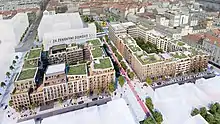 The project is the result of an international architectural competition and also takes into consideration the demands of individual Prague residents.[3] The urban design of Smíchov City - North and the plan for the SM 1 administrative complex were created by the studio A69.[4] The design is grounded in the principles of a traditional city based on high-quality public space in the form of streets, parks, and squares bordered by city blocks, and is lively, safe, and beneficially multifunctional. The project includes plans for transit and parking, trees in the streets and inner courtyards, and a lively parterre. The space is intended to be a true home that will connect work, housing, shopping, school, and rest in one location.[5] The neighborhood on the whole, which will connect fluidly with the surrounding buildings, is projected as a compact city space following a concept familiar in Western metropolises which allows the transit load to be reduced to a minimum.[6] Based on the recommendations of a jury, seven studios will work on the project's architecture: A69, Kuba & Pilař architekti, Haascookzemmrich STUDIO 2050, Chalupa architekti, Lábus – AA – Architektonický ateliér, D3A, and Projektil architekti.[1][7]