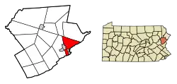 "In 1746, the first action was taken for the formation of Smithfield Township, the first municipal division north of the Blue Mountains. The petition contained the names of twenty-seven landholders."[3] The township comprised all the settlements above the mountains. Originally in Bucks County, Smithfield Township was erected in 1748.[4] "In 1752, when Northampton County was set off from Bucks County, it comprised all of Smithfield which included what is now Lehigh, Carbon, Monroe, Pike and Wayne" Counties.[3]