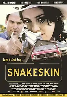 Snakeskin is a 2001 New Zealand road thriller film directed by Gillian Ashurst. The story focuses on Alice (Melanie Lynskey) and her best friend Johnny (Dean O'Gorman), who embark on a road trip across New Zealand. Along the way they pick up an American hitchhiker named Seth (Boyd Kestner), who is on the run from a gang of skinheads (led by Oliver Driver) and a group of drug dealers.