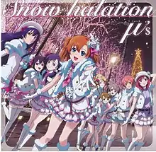 "Snow Halation"[lower-alpha 2] is a pop song by the Japanese idol group μ's as part of the Love Live! multimedia franchise. Composed by Takahiro Yamada with lyrics by Aki Hata, it was released by Lantis as the group's second single on December 22, 2010. The release was accompanied by a six-minute anime music video produced by studio Sunrise. A re-animated sequence was broadcast in June 2014 as an insert song in the ninth episode of the second season of the Love Live! School Idol Project anime television series.