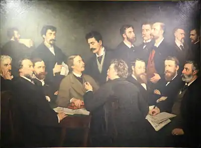 A group portrait by society member Edmond Lambrichs shows the 16 artists of the original organizing committee.[9] The society attracted in particular landscape painters working at the Atelier Saint-Luc of Brussels, also known as the Académie de Saint-Luc (ca. 1846–1864).[10] Louis Dubois, Félicien Rops, Constantin Meunier and Louis Artan de Saint-Martin are considered leading members.[11]