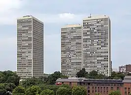 Society Hill Towers is a three-building condominium located in the Society Hill neighborhood of Philadelphia, Pennsylvania. The complex contains three 31-story skyscrapers with 624 units on a 5-acre (2.0 ha) site.[1] The towers were designed by I. M. Pei and Associates and are constructed of cast-in-place concrete, with each apartment featuring floor-to-ceiling windows.[2] Completed in 1964, the apartments were originally rental units but were converted to condominiums in 1979.[1]