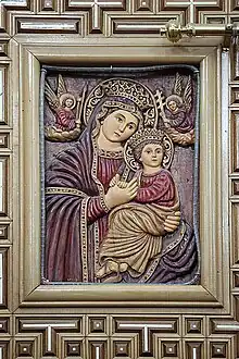 - The Church of the Holy Virgin (Arabic: كنيسة السيدة العذراء, Kanīsat as-Saiyida al-ʿAdraʾ). The church is located in the north of the bazaar (souq Qaiṣarīya). It consists of five naves. There are three sanctuaries for Saint George (left), the Holy Virgin and the Archangel Michael at the ends of the middle three naves. All sanctuaries are completely screened by a wooden iconostasis. On both sides of the entrances to the sanctuaries are wooden icons of the Holy Virgin and Jesus. The Lord's Last Supper and the crosses are located above the iconstasis. The presentation in the central nave is framed by a fish and a pigeon; the other ones are framed by angels and a dove. Galleries are located above the aisles and the entrance. On the walls are paintings of saints and scenes from the life of Jesus.