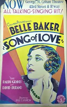 Song of Love is a 1929 American pre-Code musical film directed by Erle C. Kenton and starring Belle Baker and Ralph Graves. It was released by Columbia Pictures on November 13, 1929.[1] The film was the film debut of Belle Baker.[2][3] The film contained songs but was also issued in a silent version. Actress Eve Arden made her film debut in the film, appearing under her real name, Eunice Quedens.