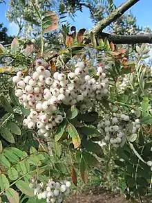 Sorbus forrestii, commonly known as Forrest’s rowan, is a species of flowering plant in the family Rosaceae, native to western China. Growing to 8 m (26 ft) tall and broad, it is a spreading deciduous tree with leaves up to 20 cm (7.9 in) long, each divided into up to 19 leaflets (pinnate). White flowers in spring are followed by masses of white berries with pink tips in autumn.[2]