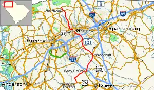 Northwest of Reidville, the highway interchanges with I-85 at exit 60, forming a parclo interchange. Continuing into Greer, the highway passes Greenville-Spartanburg International Airport before intersecting SC 80. In Greer, the highway intersects with SC 357's southern terminus and becomes concurrent with SC 290 heading west. It then runs concurrently with US 29 for about 0.3 miles (0.48 km) and then continues northwest. After about a tenth of a mile, SC 101 tracks north, crossing over the South Tyger River before making its way through Highland, and running concurrent with SC 414 for a tenth of a mile before continuing northwest. The route reaches its northern terminus at SC 11 in northern Greenville County.[5]