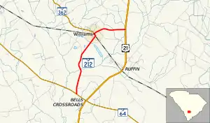 SC 212 is a two-lane rural highway that connects the town of Williams between SC 64 and U.S. Route 21 (US 21). Within Williams, it intersects SC 362 at its eastern terminus.[2]