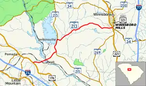 SC 213 begins at an intersection with U.S. Route 176 (US 176) southeast of Pomaria within Newberry County, where the roadway continues as Parr Road. It travels to the east and crosses over Crims Creek. A short distance later, the highway crosses over the Broad River, Hampton Island and some railroad tracks on an unnamed bridge. This bridge marks the Fairfield County line. SC 213 travels to the northeast and intersects SC 215 (Monticello Road) near Jenkinsville. The two highways travel concurrently along the southeastern edge of the Monticello Reservoir. They split, with SC 213 traveling to the east. A short distance later, it curves to the northeast and then crosses over Little River. Farther to the northeast is a crossing of Robinson Branch. It skirts along the southwestern edge of the city limits of Winnsboro. After a short rural section, it meets its eastern terminus, an intersection with US 321/SC 34 just southwest of Winnsboro Mills. This intersection also marks the southern terminus of US 321 Business (Columbia Road).[3]