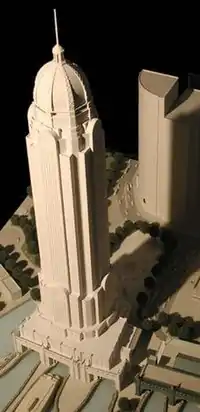 The South Ferry Plaza, also called A Lighthouse At The Tip Of The Island,[2] was a supertall skyscraper proposed in 1987[3][4] to rise right next to the East River on Manhattan Island in New York City.[1] The building would have sat on top of the South Ferry terminal and tower 1,084 ft (330 m) above street level, with 60 stories of office space.[2] It was designed by architect Fox & Fowle Architects and Leslie E. Robertson Associates.[1] The architects designed the building for office use and the skyscraper incorporated recycled marble and steel with glass in its structure. The architectural plan had a glass dome that was supposed to be lit at night, which also contained an observation deck and three restaurants located inside the dome.[2] In addition, the project called for the renovation of the South Ferry Terminal, including the train station so it can accommodate 100,000 people. The project would have doubled the size of Battery Park if it had proceeded, since the building included a plaza that was planned to tie in with Battery Park via a new promenade at the tip of Manhattan.[2] The project was canceled in 1991 because of a lack of funding.[5]