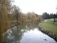 The facilities are a bandstand, play park, multi-use games area, skate park, bowling green, green gym, aviary and cafe.[7] The pavilion has a clock tower, there is a refreshment kiosk dating to 1908 and flower beds with a terracotta jardiniere. To the North there is a lake with three islands, the perimeter of which was planted with poplars. The park has held a Green Flag Award since 2006.[7]