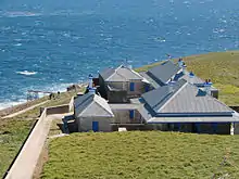 The lighthouse keepers' residence consists of one chief keeper cottage and two semidetached assistant keeper cottages.[2] They are made of mass concrete, rendered and painted.[10] The residence is surrounded by high stone walls as protection from weather conditions. A high stone wall also runs from the houses to the lighthouse. There is also a room near the residence which served as a little schoolhouse, with a governess teaching the children of the keepers.[3]