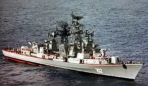 From 1 June 1967 to 31 June 1967 and from 1 January to 31 December 1968 the destroyer rendered assistance to the armed forces of Egypt and from 5 October to 24 October 1973 - to the armed forces of Syria.[1] From 10 March 1981 to 19 July 1984 the ship has been repaired in Sevastopol.[1] Krasny Kavkaz was initially tasked with confronting the U.S. warships during the 1988 Black Sea incident, but due to her technical problems the frigate Bezzavetny was dispatched instead.[2]