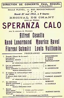 Calo-Séailles' influence reached diplomatic circles, with Greek Prime Minister Eleftherios Venizelos attending her recitals in 1919 during the Paris Conference negotiations. Elena Venizelos, the prime minister's second wife, also attended performances by Calo-Séailles. In addition to performing Byzantine hymns and classical Greek music, Calo-Séailles regularly presented popular Greek melodies, both unaccompanied and harmonized by Greek and French composers, including Maurice Ravel. Her voice was praised for its beauty and expressive force in translating the dramatic accents of popular songs.[5]