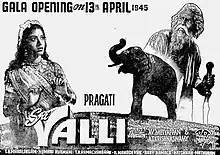 The first talkie version of the story was produced by Samikannu Vincent in 1933. Named Valli Thirumanam, the film was shot in Calcutta and directed by P. V. Rao.[6] T. P. Rajalakshmi played the role of Valli in the which ultimately became a box-office success. Sixteen years later after the 1945 film, a colour Sri Valli (1961 film) based on the same story was produced by Narasu Studios. It had Sivaji Ganesan and Padmini as the lead pair.[6] T. R. Mahalingam who played Muruga in the previous version was given the role of Narada in this film.[6]