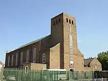 St Aloysius, Roby, on the outskirts of Liverpool. The church designed by F. X. Velarde and consecrated on 23 April 1885. It is a Roman Catholic church of the Archdiocese of Liverpool.