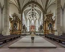 In 1495, a late-Gothic high altar was added. Around that time construction of the polygonal east choir and the transept started. However, few works of art survived the destruction caused by the Peasants' War of 1525. One of them was a Madonna by Tilman Riemenschneider (ca. 1490).[1][2]