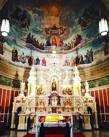 Detail of High Altar and Mural in St. Casimir Church Cleveland, Ohio. Altar made in Rigalico, marble and onyx effect, specially designed and executed in the studios of Daprato Statuary Company, Chicago