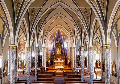 In 1892 the present rectory was built as a Franciscan monastery with 30 rooms plus a spacious attic. The previous rectory was located directly to the east of the church and needed to be moved to make way for an expansion of the church building. The parish then numbered about 100 families, fairly evenly divided between farmers, railroad people, and other business people. In 1894 the church was expanded, adding an apse and two transepts containing large stained-glass windows made by George A. Misch and Brothers of Chicago. The south window depicts the three patrons of the Franciscan order: St. Clare, St. Louis IX, King of France, and St. Elizabeth.[3] The north window shows the Holy Family of Jesus, Mary, and Joseph. The four stained-glass windows in the apse depict St. Francis receiving the stigmata, the Annunciation, the child Jesus appearing to St. Anthony, and St. Margaret Mary Alacoque receiving the devotion to the Sacred Heart. Much of the statuary dates back to the late 19th century and was manufactured in Munich, Germany.[4]: 55