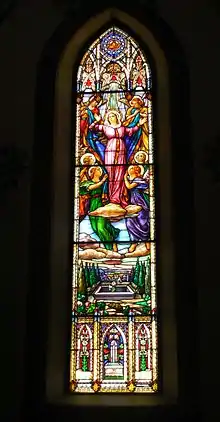 The stained glass windows were created by Guido Nincheri of Montreal sometime between 1941 and 1948. Nincheri also undertook replacing the interior church paintings. Further improvements that occurred during this period included; the replacement of the pews within the sanctuary, the altar, pulpit, choir loft, communion rail, flooring, confessionals, and the sloping ceiling. The chandeliers were replaced with indirect fluorescent lighting. Recessed lighting was installed over the side aisles. The majority of the carved oak interior woodwork was undertaken by local craftsman, Leopold Leclerc.[12]
