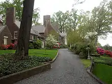 Between 1929–1931, Burnett built a Federal Period mansion, part of the early-twentieth-century classical revival movement, modeled after the Homewood Museum on the Johns Hopkins University campus in Baltimore. He commissioned bay schooners to carry the tons of bricks necessary to build it.[1] The mansion, built on a Palladian style five-part plan, occupies the crest of the island and is the centerpiece of St. Helena. There are six fireplaces, each in a different type of marble imported from Europe: many of the floors on the main level are marble checkerboards. Other flooring is made from inch-thick mahogany which dented the tools of electricians and telephone mechanics who attempted to string new wiring in the 1950s. There are also several safes built into the masonry, scattered throughout the house, including a walk-in size safe in the den. Several other homes on the island served as housing for patients and counselors of the Burnett Hospital for Crippled Children, which operated from 1936–1943. There are 22 structures total scattered through the island.[1] There is also a conical roofed and a circular brick water tower on the northern point of the island, now converted to an office with a view.[2]
