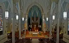 The church is a Gothic Revival structure, built in the shape of a Latin cross.[3]: 225 Its exterior consists of brick walls and a gabled roof, upheld by a stone foundation. The most prominent aspect of its exterior is a massive belfry and clock tower,[2] approximately 200 feet (60 m) tall.[3]: 226 Large rose windows illuminate the interior,[2] which features painted and frescoed walls; the distance from the floor to the apex of the ceiling vault is 62 feet (19 m).[3]: 226 The exterior design is similar to two other churches by Adolphus Druiding; St. Patrick (1891) in Toledo, OH and St. Michael (1890) in Rochester, NY. A major renovation project in the 1970s led to significant changes in the sanctuary, including the removal of frescoes by Austrian-born artist, Joseph Vittur, statues and its High Gothic altar.[2], designed by the E.Hackner Co., LaCrosse, WI.