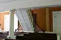 The interior furnishings are mostly of simple design. Slip pews with doors, each labeled with roman numerals, span the nave in four sections and extend along each side to frame the chancel. A balustrade with turned balusters spans the three sides of the chancel, opening with two gates at the back wall on each side. The gallery extending across the rear of the nave is accessed by a central staircase. Two flights rise along the back wall from each door to a shared landing, where a flying stair continues up to the gallery floor.