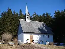 St. Martin’s Chapel (German: Martinskapelle) stands at an elevation of 1,085 metres above sea level (NHN) at the upper end of the Katzensteig valley on the territory of Furtwangen just above the source of the Danube. It is also not far from the source of the River Elz and thus the main European watershed between the Rhine and the Danube. The West Way, a major hiking trail in the Black Forest runs past the chapel as does the long-distance ski trail from Schonach to Belchen.