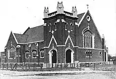 Before the present Modernist brick and concrete church was built, a large stone-towered Protestant-looking church was in use as photographed in 1914, which likely indicates the congregation had purchased and reused an existing church building before erecting the present structure.