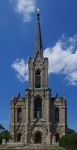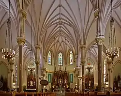 The church underwent extensive renovations in the 1920s under the guidance of pastor Fr. Francis Keyes. Changes included new chandeliers, flooring and art work. In 1937, a new cross was added to the steeple. On September 9, 1980, the 240 ft (73 m) steeple was destroyed by fire caused by a lightning strike. Falling debris damaged the roof and other portions of the structure. After her death February 25, 2006, Parishioner Margaret Tank bequeathed funds for the steeple's reconstruction and other upgrades in the church.[4] The gift also allowed for repairs to the sanctuary's organ which was also damaged in the 1980 fire. The two-manual Rodgers electronic organ that incorporated 17 ranks of pipes from an earlier Kilgen organ was upgraded to a four-manual instrument.[5] The steeple and other projects were completed August 28, 2007.[6]