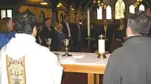 During this period, icons and votive candles were introduced into the church, and an aumbry was installed allowing for reservation of the consecrated Bread and Wine for use in administering Communion to sick parishioners. Practices like Exchanging the Peace were introduced, together with ceremonies like Washing of Feet on Maundy Thursday, all of which increased the level of participation in the Eucharistic celebration by members of the congregation.[26]