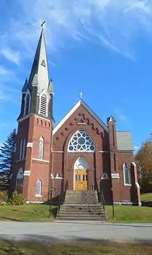 The current church was designed by George H. Guernsey (1839-1900), a self-taught architect who had served for a term as mayor of Montpelier, Vermont in 1897,[5] and had designed a number of prominent buildings in Vermont and New Hampshire, including a number of catholic churches, such as; St. Augustine Church (Montpelier, VT), Immaculate Heart of Mary Church (Rutland, VT), Notre Dame de Victories Catholic Church (St. Johnsbury, VT),[6] and the Sacred Heart Saint Francis de Sales Roman Catholic Church (Bennington, VT); as well as churches for other denominations, including; the Methodist Episcopal Church (Barton, VT) and the United Baptist Church of Lakeport (Laconia, NH). Of his architectural style, it has been stated that Guernsey employed dramatic corner towers and asymmetrical massings in his designs, often combining "square-spired" and "conically topped round towers".[7][5]