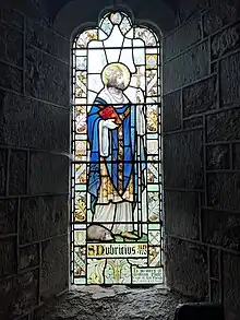 The south aisle contains a stained glass window depicting St Dubricius erected in memory to Rev. William Poole, vicar from 1854 to 1901. At the saint's feet is a hedgehog which were prolific in the locality and the emblem of the Herefordshire Yeomanry.[3]