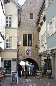 St Giles' Church (German: Ägidienkirche, also St. Ägidii[1]) in the historical centre of the city of Erfurt in Thuringia, Germany, forms the eastern entrance from Wenigemarkt (Minor Market) to the Krämerbrücke (Merchants' Bridge) with its archway. The single-nave Gothic church building[2] is one of the former two bridgehead churches. At the western end stood the Benediktikirche (St Benedict's Church) since the 11th century, which was demolished in 1890[3] and is now only remembered by the name of Benediktsplatz (St Benedict's Square).