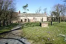 The church is constructed in roughcast stone with slate roofs. Its plan consists of a single cell (i.e. there is no transept and the chancel and nave share the same space with no dividing arches or screens between them). A vestry is attached to the east end of the north wall, and a porch covers the entrance at the west end of the south wall. The porch was rebuilt in 1825.[5]