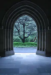 The main facade on the north wing is a typical exercise in Victorian near-symmetry, with the central tower nearly in the middle. Under the tower is a porte-cochère. Continuing south along the visitor's line of entry on the main axis is a visually low, dark vestibule. This enhances the view, through an open arcade and transverse passage, of the more brightly sidelit formal stone staircase. To the north of the stair hall on the principal floor is the central space. To the east of this space is the chapel, viewed through an arcaded screen. To the south is a vista across the stairwell, through an ante-room to the library and on to the students' accommodation. To the west is the Great Hall, although this was not visible from the central space on Wardell's original design. Lastly, through a wide opening to the north is the Lady Chapel in the tower.