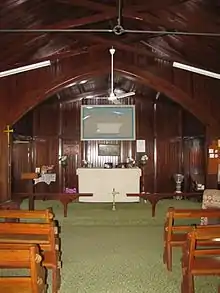 Internally, the nave and sanctuary combined measure approximately 7 by 9 metres (23 ft × 30 ft). Most of the internal finishes of the building are silky oak, including the varnished v-jointed tongue-and-groove boards lining the walls and raked ceiling; the timber scissor trusses of the roof framing, which are exposed internally; the arch of the sanctuary; and the altar rails.[1]