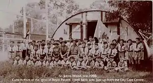 The Scout section started in August 1945, with four boys from the Ashgrove Troop and six new recruits, meeting at the hall in Laird Street in the grounds of Granite House. William arranged for a lease of land in Royal Parade from the Brisbane City Council and purchased an Army Quonset Hut from the United States Army for the St John's Wood Cubs after WWII. The first Scout Master was Jas "Skip" Garland, who came from Baralaba.[72] The Senior Scout section of the Group started in 1954. In his annual report, the Chairman of the Group Committee reported[73] that Cliff Farmer was appointed Senior Scout Master. The 'Seniors' met in the Army Quonset Hut on Friday nights while the Cubs met there on Saturdays. Senior Scouts are known now as Venturer Scouts. The Rover Scout section started in 1959. "Secondly, during March we began a Rover Crew, thus adding the fourth section to the Group."[74] The first Rover Leader was Ian "Sailor" Webb who came to us through a fortuitous meeting with the then Group Scout Master "Kernel" Matthews.