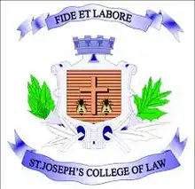 St Joseph's College of Law is a Jesuit law school in Bangalore, in Karnataka, in south-western India. It was founded in 2017. It is part of St. Joseph's Institutions. It is affiliated to Karnataka State Law University, Hubballi, and approved by the Bar Council of India in New Delhi.[1][2][3]
