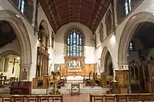 The present building was designed by E. M. Bruce Vaughan, and built in the years 1913–1915, on the site of an earlier church constructed of galvanised iron.[1] In 1924 a new daughter church was built at Townhill to serve the developing estates at this end of the parish. In 1937 the parish of St Nicholas Townhill was carved out of St Jude's to serve this area.
