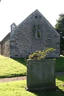 The church is built from rubble masonry, dressed with sandstone, and measures 47 by 14 feet (14.3 by 4.3 m).[3][8] The entrance is at the west end of the north wall. The roof, which is made from slate, has a bellcote with one bell at the west end. The inscription on the bell states that it was cast in 1582, and the bell is also marked with a fleur-de-lys and the thrice-repeated initials "AMN".[3]
