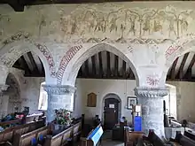 In the splay of the north nave window is a 14th-century depiction of Christ standing on a wheel and surrounded by the tools of different trades. He has his arms raised, apparently to better display his wounds. The tools include tailor's shears, a butcher's cleaver, a carpenter's square and a weaver's shuttle. Above Christ's right shoulder there are two dice.[5] Similar paintings are found in many other medieval English parish churches. The subject has been much discussed in the past but has been conclusively identified as a warning against breaking the Sabbath.[15] The message is that by working on Sunday one inflicts new wounds on Christ.[5][15]