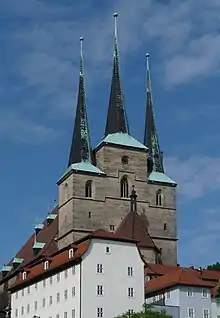 St Severus' Church (German: Severikirche) in the city of Erfurt in Thuringia, Germany, is a Roman Catholic church building. It stands on the Domberg (Cathedral Hill) directly next to St Mary's Cathedral. As a unique architectural ensemble, both churches together form the city's landmark. Due to its unusual form, which seems to anticipate the late Gothic hall church, St Severus' Church is one of the most important Gothic buildings in Germany. The bones of the church patron Severus of Ravenna rest in an artistically very significant sarcophagus.