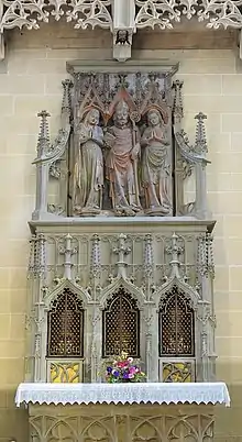 The late Gothic Virgin Mary altar (1510) in the northern side aisle is attributed to the Saalfeld School. In the shrine, the cupboard-like centrepiece, the enthroned Mother of God Mary is flanked by the standing figures of St Barbara (with chalice) and St Catherine (with sword). The figures of saints on the side wings are carved in flat relief and show St Ursula (with arrow and book) and Mary Magdalene (with ointment jar). When the side wings are closed, the Annunciation of the Nativity by the Archangel Gabriel can be seen.[1]