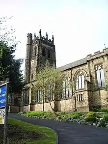 The church is constructed in sandstone with freestone dressings. The external walls are in yellow sandstone; the internal walls in red sandstone. The roofs are slated. Its plan consists of a nave with north and south aisles, a southwest porch, a north transept containing the organ chamber, a south transept comprising a chapel, a chancel with a north vestry, another vestry in the angle between the south transept and aisle, and a west tower.[2] The architectural style is Gothic Revival, described in the National Heritage List as Perpendicular,[2] and by the authors of the Buildings of England series as Decorated.[3] The tower is in three stages, with angle buttresses, and a polygonal stair turret at the southwest corner that rises to a level higher than the tower.[2][3] On the summit of the tower are pierced embattled parapets and pinnacles. The tower has a west doorway, above which is a five-light window. In its middle stage are pairs of ogee-headed windows, clock faces, and a frieze of shields. The top stage contains louvred bell openings, one on the south side, and two in pairs on each of the other sides. Along the walls of the aisles are large four-light windows. The porch is tall with an embattled parapet, canted angles, and angle buttresses. Above its moulded entrance arch is a statue of Saint Silas in a niche surmounted by a pinnacle. The transepts contain pairs of square-headed two-light windows, and have embattled parapets. The chancel has a south square-headed two-light window, a seven-light east window, a parapet of blind quatrefoils, and a southeast turret with a spirelet.[2]
