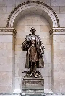 In 1901, Massachusetts Governor Winthrop M. Crane signed into effect a resolution calling for the creation and dedication of a statue in Bartlett's honor on the grounds of the Massachusetts State House. The statue would be paid for by the government of Massachusetts at a price not to exceed $20,000.[2] The following year, the Massachusetts Governor's Council passed an ordinance requesting sculptor Daniel Chester French to submit a proposal for the statue, with a contract between French and the government dated January 29 of that year.[3] Architect Henry Bacon would craft the pedestal for the statue.[4] In 1903, the Massachusetts General Court amended their previous resolution by allowing the Governor and his council to place the statue within the state house,[5] and that same year, they decided that the statue would be located in the memorial hall of the capitol.[6] The casting for the statue was done by the Bonney-Bonnard Company of New York City.[7]