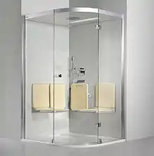 A steam shower is a type of bathing where a humidifying steam generator produces water vapor that is dispersed around a person's body. A steam shower is essentially a steam room that offers the typical features of a bathroom shower. Steam showers are generally found in self-contained enclosures that prevent the water vapour from escaping into the rest of the room, avoiding damage to drywall, paint, or wallpaper. Steam showers combine the functionality of a standard steam room with many additional features including a shower, FM radio and hydrotherapy. Steam showers are available in a variety of materials, including tile, acrylic, fiberglass, glass, stone, and wood.